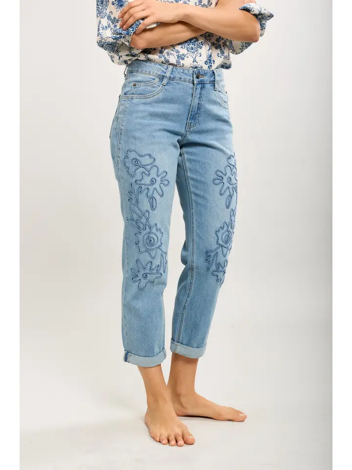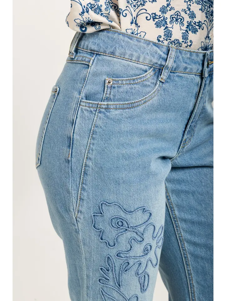 Bekväma stretchiga jeans med dragkedja stängning och med broderade blommönster på framsidabn.